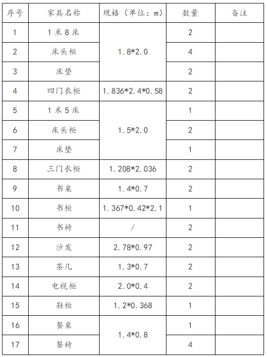 3、项目概况:宝福路校区公租房现有家具因使用年限较长,普遍存在老化、损坏等情况,已影响正常居住使用。为改善教职工居住条件,现拟对相关房源配置一批全新家具,以满足基本生活需求。具体采购清单与参数要求如表1所示。