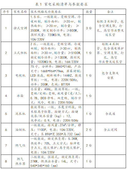 3、项目概况:为落实陕西机电职院发【2023】82号文件精神,切实完善公租房居住功能,现计划依据文件系统性采购一批涵盖全屋各功能区域的配套家电。具体采购清单与参数要求如表1所示。